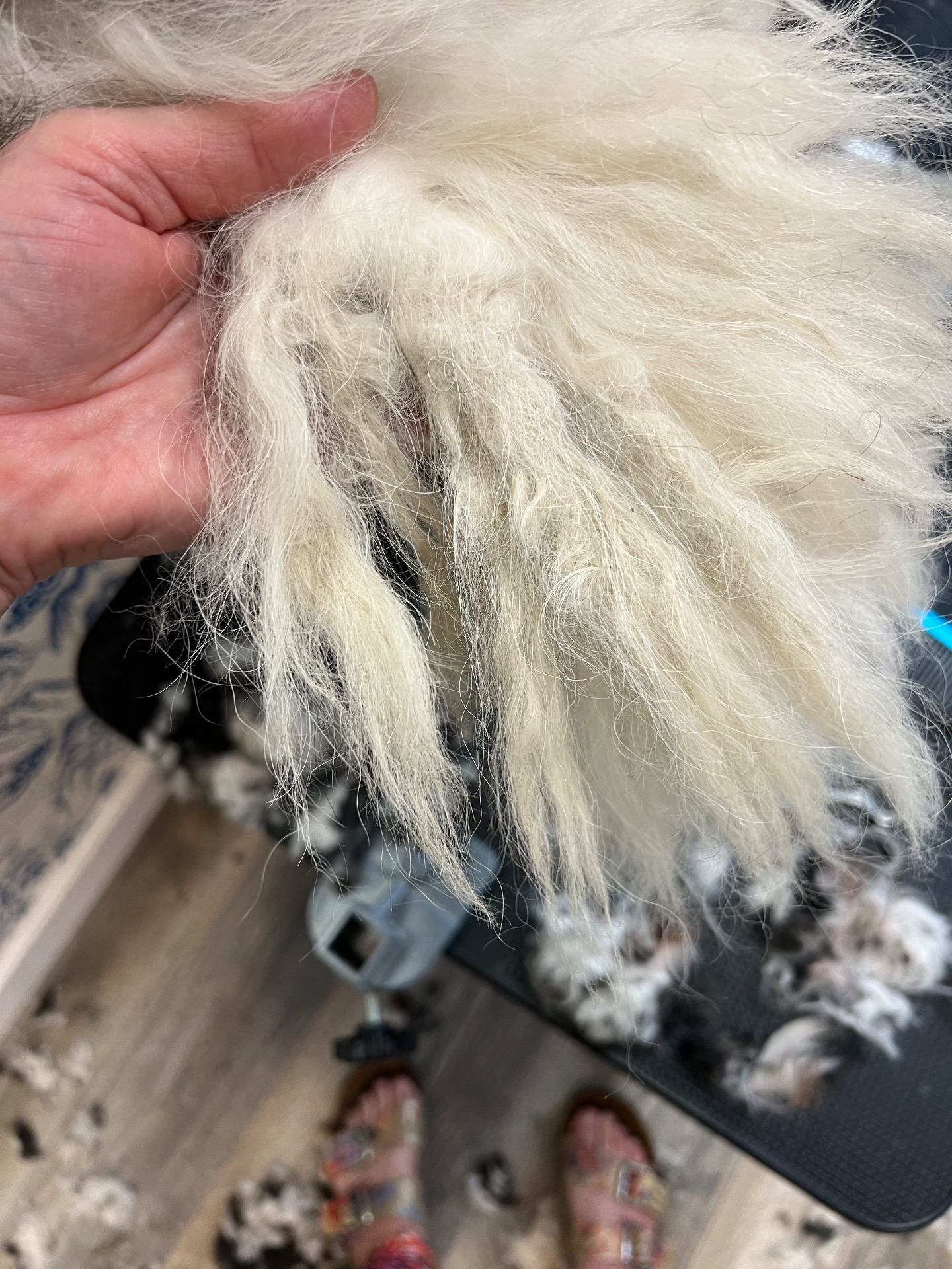 Man vet inte vad som döljer sig under en ymnig päls och man behöver ha koll på hundars anatomi när man letar sig fram till vad som är hund och päls. Man strävar efter ett lugn och att ta det varsamt, så att hunden inte blir orolig och samtidigt så behöver man avancera framåt. På bilden ser ni delar av en svans med tovor. En del svansar är er benägna att tova ihop sig än andra.
